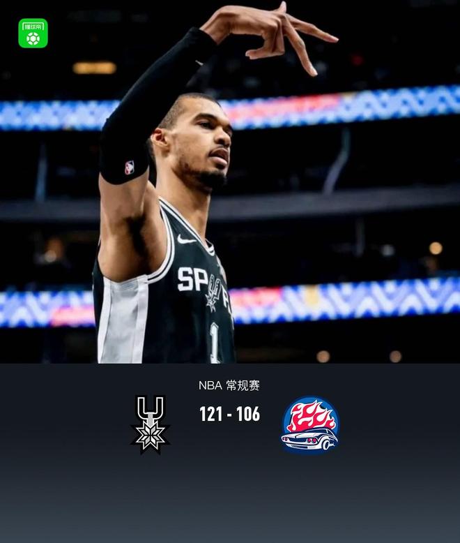 馬刺121-106雙殺活塞,文班亞馬38+16+5帽,坎寧安26+8
